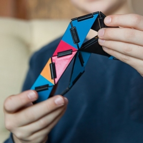カラフルなイヴァンズヒンジを折り曲げたりたたんだりして問題カードと同じ形を作ってみよう。
