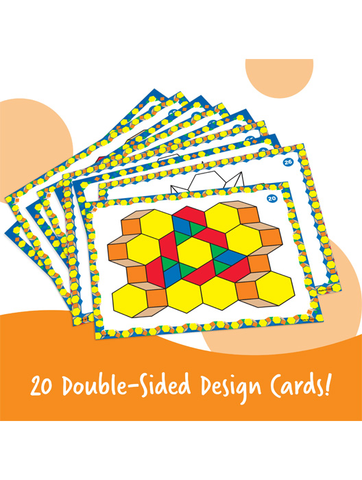 お花や生き物など様々なパターンやデザインが楽しめるパターンカードが20枚 (両面で40パターン) 付属しているので、 パターンに合わせてブロックをデザインしたり、独自のパターンを想像して作ったり、楽しみながら図形学習ができます。