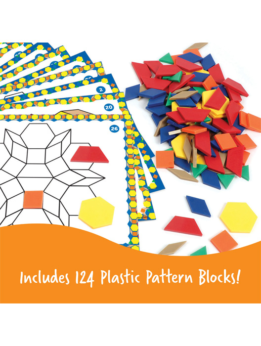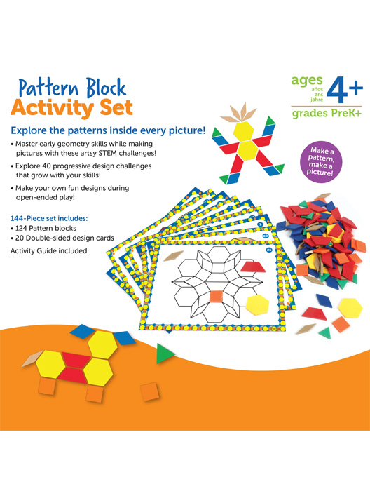 パターンブロック : 124個、6種 (三角形、正方形、ひし形、平行四辺形、台形、正六角形) / パターンカード (両面印刷) : 20枚、アクティビティガイド (外国語) / 対象年齢 : 4歳以上